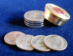 This precision made brass prop makes dreams come true - it doubles money like magic. The magician places a stack of nickels on the table and covers it with a brass cap. Instantly, the nickels have turned into a stack of dimes! There is no sleight of hand involved in the trick. |